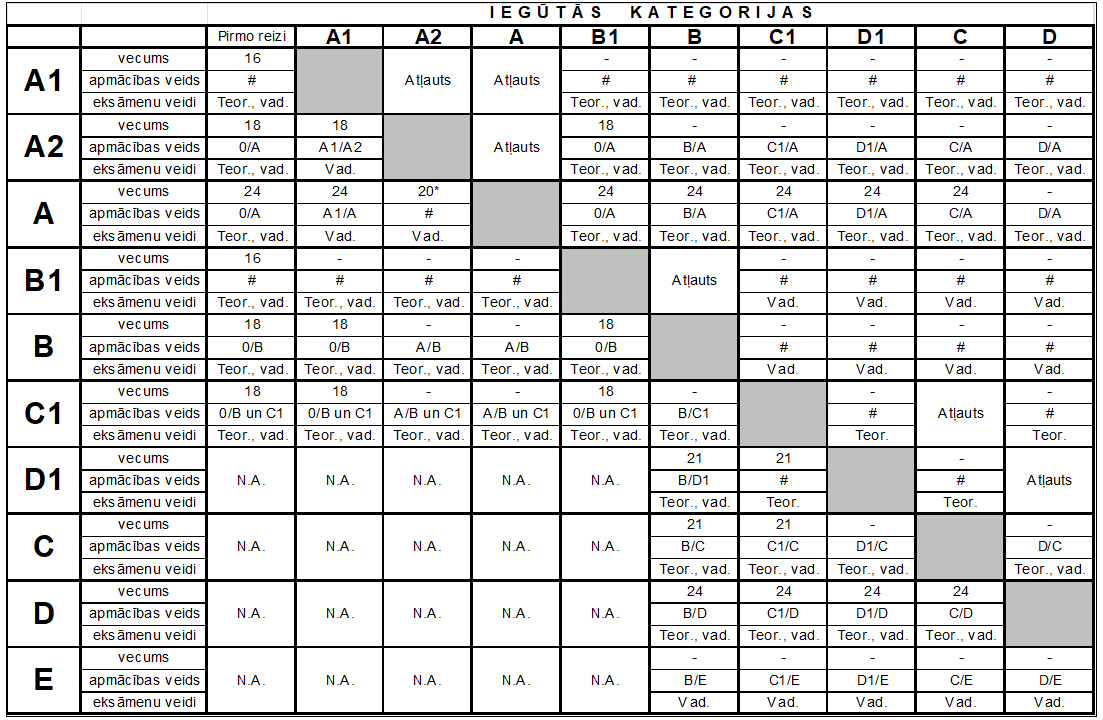 Lai iegūtu D kategoriju (autobuss), interesentam bija jāiziet cauri neadekvāti garai ķēdei: vispirms iegūt B (vieglā automašīna), tad B+E (ar piekabi), pēc tas, C1 (mazais kravas auto), tad C (kravas auto), pēc tam CE (kravas auto ar piekabi), tad D1 (mikroautobuss), un tikai tad varēja sākt mācīties D kategorijai. Nerunājot par trīsasnieku, kam bija vēl DE, pēc visiem jau izietiem elles apļiem. Cilvēks, kurš gribēja kļūt par autobusa vadītāju, to varēja pieveikt tikai ap 30+ gadu vecumu, kad jau bija aizgājuši pensijā pieci līdz septiņi vadītāji. Un viņš, nomocīts, bez motivācijas, autobusu kategorijas iegūšanas vietā gāja celtniecībā, vai pat brauca prom.