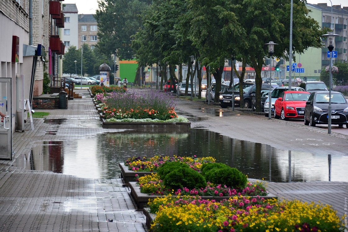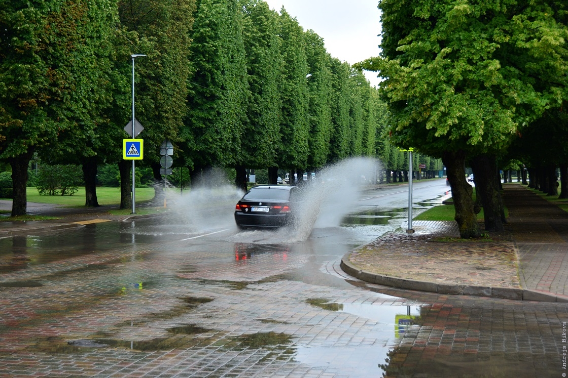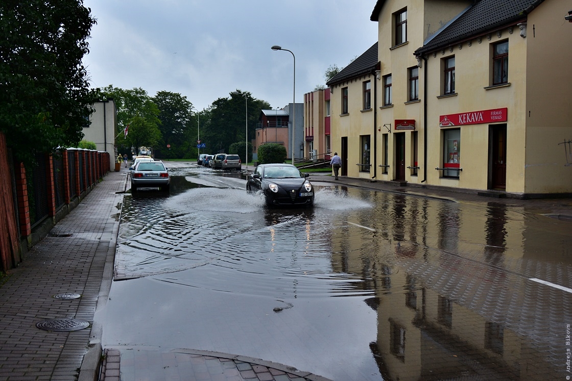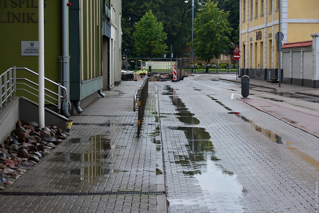 Nepilnas stundas laikā Ventspilī nolija desmit diennakšu lietus norma, applūdinot pusi no pilsētas ielām.