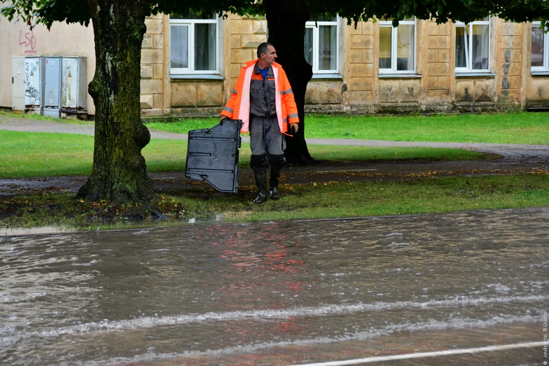 Te nu jāsaka, komunālie dienesti bija gatavi laicīgi, uz pašam problemātiskākajām vietām atgādājot darbiniekus ar tehnku, lai pēc iespējas ātrāk likvidētu lietusgāzes sekas.