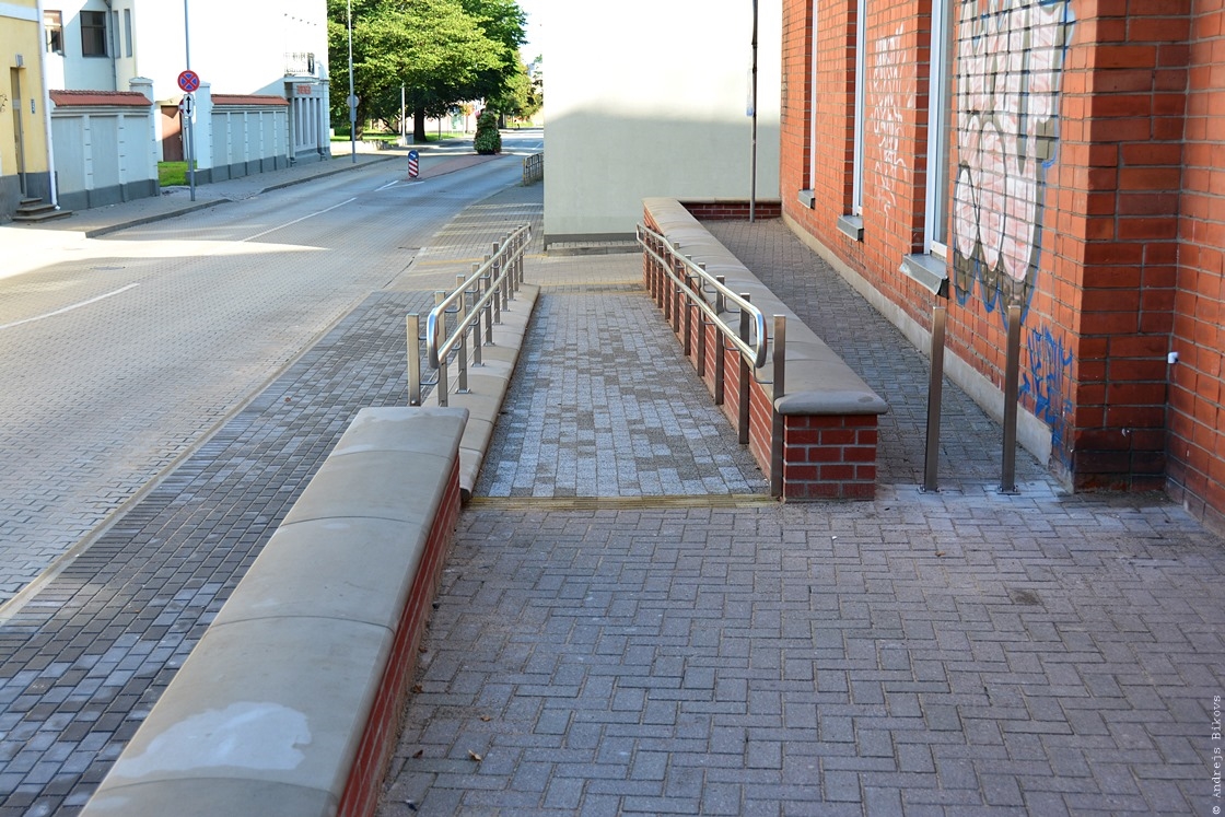 Urnas, soliņš. Plati, zemi pakāpieni. Rampas gan māmiņām, gan velobraucējiem. Nekādu žogu.